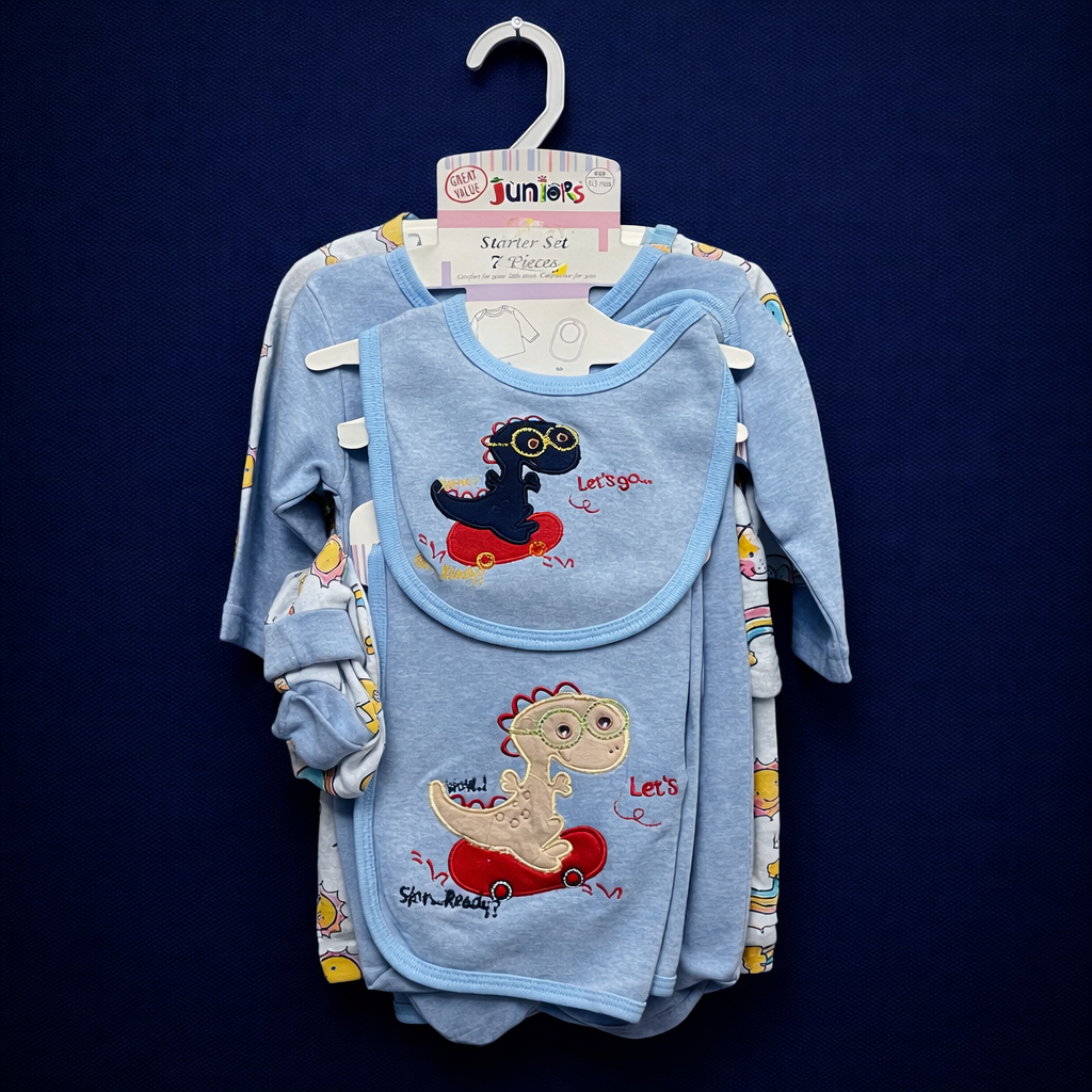 The Starter Set for Baby includes seven essential items in a versatile blue color, suitable for both baby girls and boys. This thoughtfully curated gift set provides parents with a reliable selection of infant necessities, ensuring comfort and convenience in early child care.